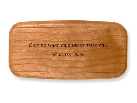 This box has plenty of room for trinkets. For small collections this box is perfect for organization and display. Made of Cherry, this box features one of our Classic handcrafted inlays and a hidden sliding dovetail lid. Hand applied inlay adds a touch of elegance and charm to this clever heirloom piece. From our Classic Inlay Collection. Quote Reads: "Only do what your heart tells you. -Princess Diana"