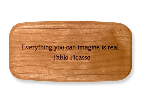 This box has plenty of room for trinkets. For small collections this box is perfect for organization and display. Made of Cherry, this box features one of our Classic handcrafted inlays and a hidden sliding dovetail lid. Hand applied inlay adds a touch of elegance and charm to this clever heirloom piece. From our Classic Inlay Collection. Quote Reads: "Everything you can imagine is real. -Pablo Picasso"