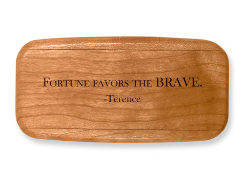 This box has plenty of room for trinkets. For small collections this box is perfect for organization and display. Made of Cherry, this box features one of our Classic handcrafted inlays and a hidden sliding dovetail lid. Hand applied inlay adds a touch of elegance and charm to this clever heirloom piece. From our Classic Inlay Collection. Quote Reads: "Fortune favors the brave. -Terence"